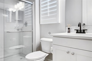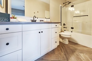 All of the bedrooms have direct access to a full bathroom, affording you the luxury of privacy, no matter where you sleep. Each sparkling clean bathroom is stocked with high-end toiletries and plush towels. The large ensuite bathroom attached to the upper-level primary suite offers a bit of extra luxury, with a freestanding soaking tub and separate shower.