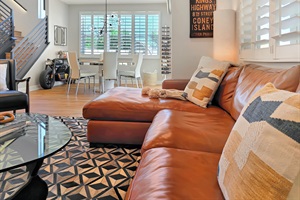The spacious living room is the perfect place to kick back and relax. Large windows let in plenty of natural light, and direct access to the outdoor area makes it easy to see what everyone is up to in the pool.