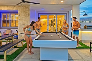 In this beautiful space, you’ll feel like you’re in a private resort. Put the game on the TV while creating a delicious pizza using the pizza oven. Swim some laps in the Olympic-sized saltwater pool before lounging poolside. Play pool, ping pong, or work on your putting in between dips in the pool to cool off. Misters will keep you cool as you enjoy fun in the sun.